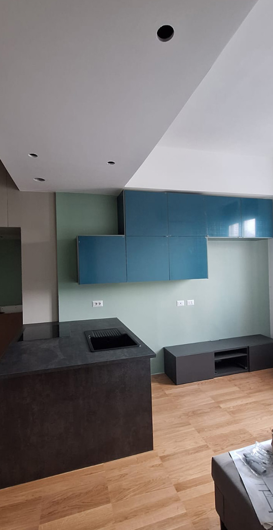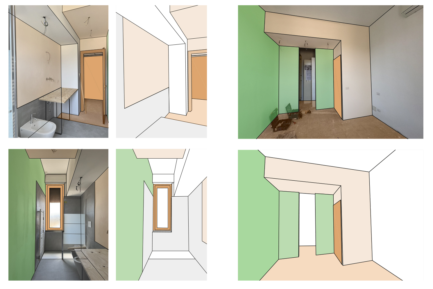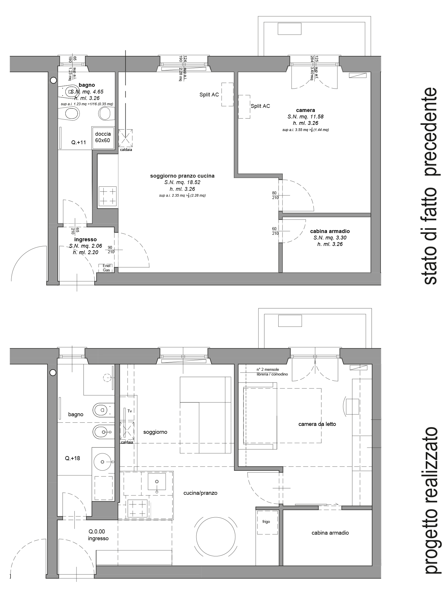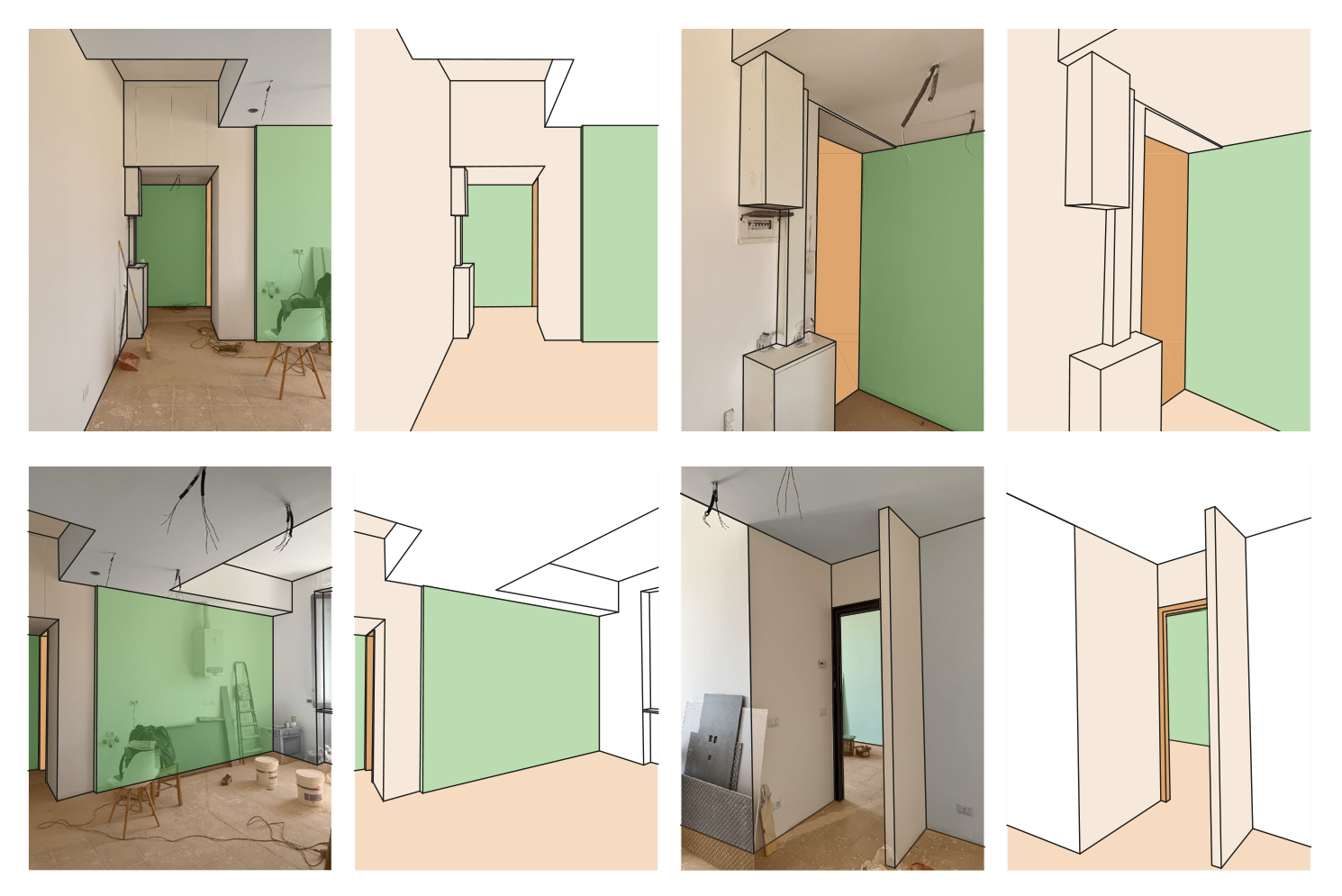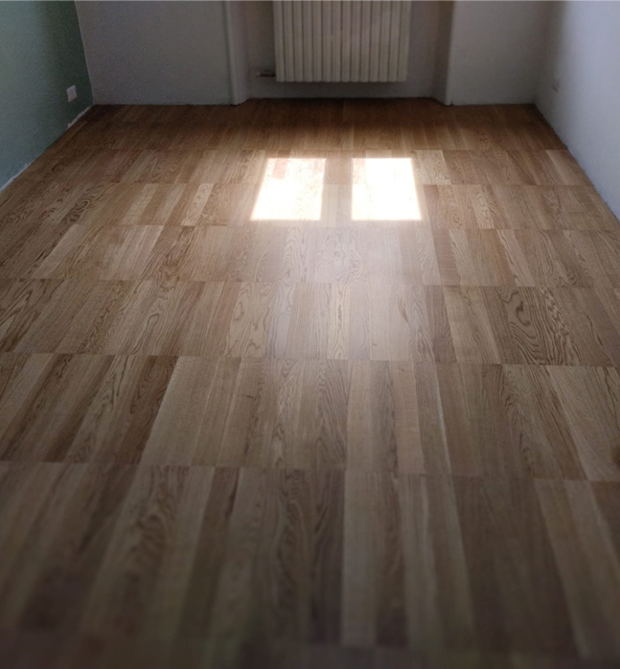 Una metratura ridotta cambia volto attraverso interventi minimali: l’allargamento del bagno, controsoffittature che vanno a definire ambienti, insieme a semplici coloriture delle pareti, un’interpretazione contemporanea dell’orditura di posa del parquet di una dimensione tradizionale delle doghe